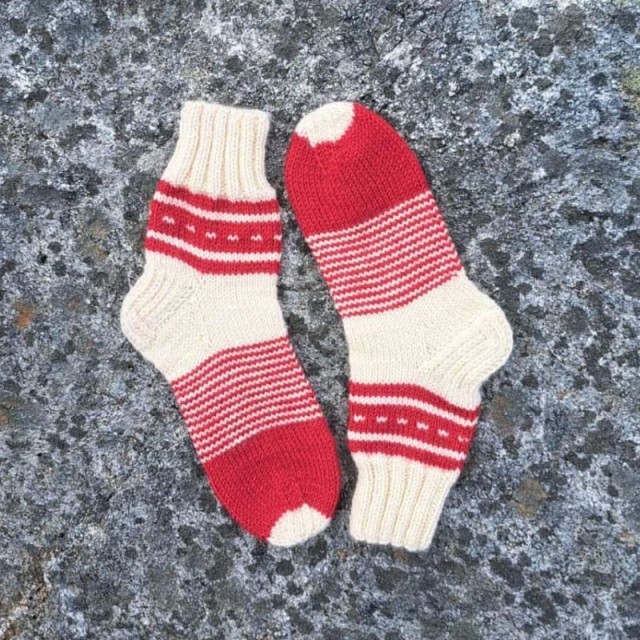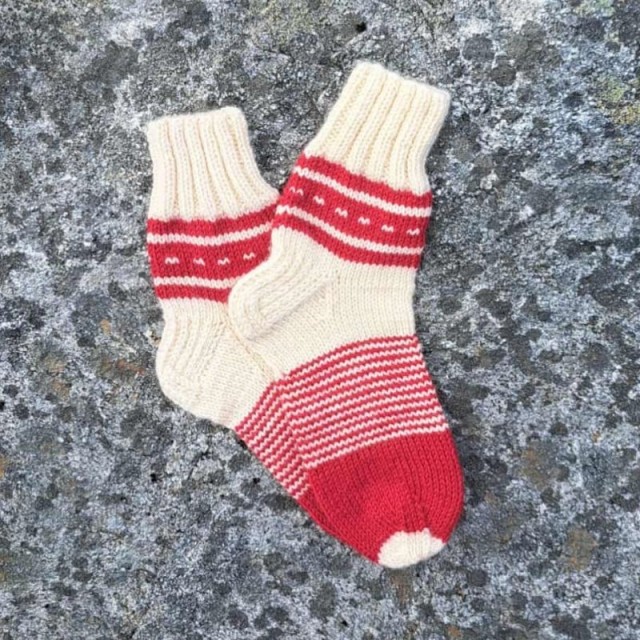 Varme og myke ullsokker i 100 % ull, håndstrikket med kjærlighet. Sokkene holder barnas føtter tørre og komfortable, både inne og ute. De fine hvite og røde nyansene gir en koselig og fargerik detalj til barnas garderobe.