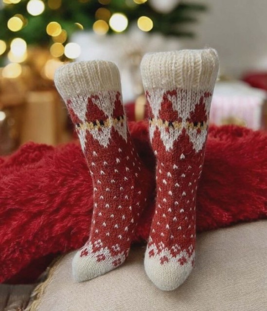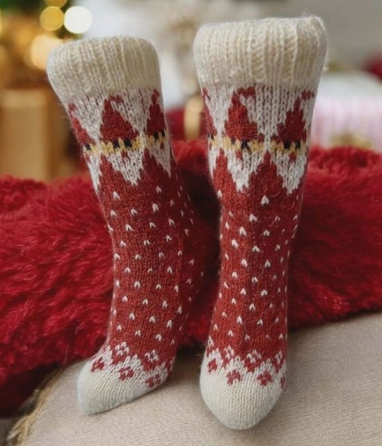 Håndstrikkede ullsokker med koselige julenisser i størrelse 38–39. Sokkene er laget av 100 % ull som holder føttene varme på kalde vinterdager. Perfekte både til hverdagsbruk og som en hyggelig julegave.