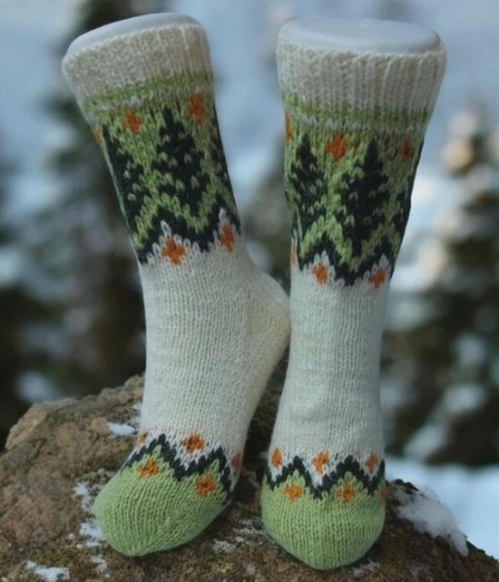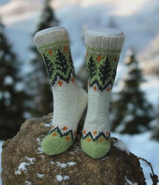 Varme, håndstrikkede ullsokker med grantrær gir et friskt og naturlig uttrykk. Håndstrikket kvalitet til dame – inspirert av norsk vinter og skog.
