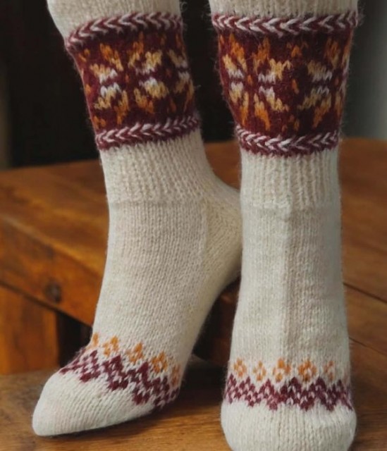 Disse ullsokkene er håndstrikket i 100 % ull og har blomstermotiv. Med fokus på kvalitet, komfort og passform holder de føttene varme både inne og ute på kalde høst- og vinterdager. Et unikt og vakkert tilskudd til garderoben, eller en flott gave til noen som setter pris på håndlaget kvalitet.