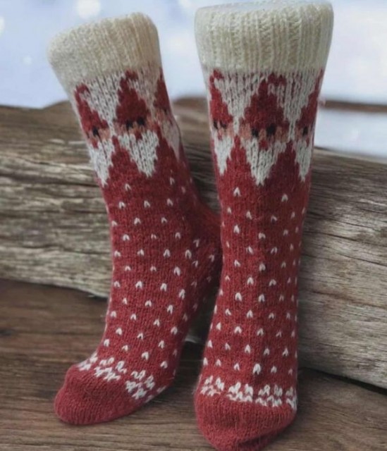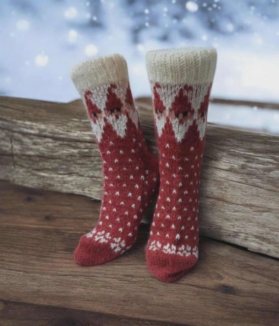 Disse håndstrikkede ullsokkene med julenisser sprer både varme og juleglede! Strikket med omtanke i størrelse 39–40 – ideelle til førjulskos og som personlig julegave.