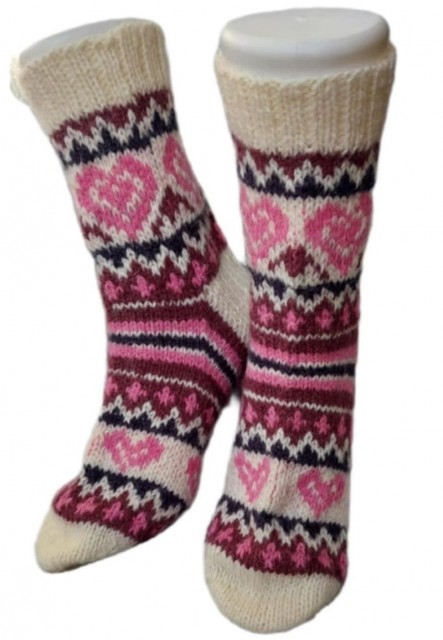 Disse nydelige damesokkene er håndstrikket med kjærlighet i 100 % ren ull. Med søte rosa hjerter er de både varme og dekorative - perfekte som gave eller til egen hverdagsluksus.