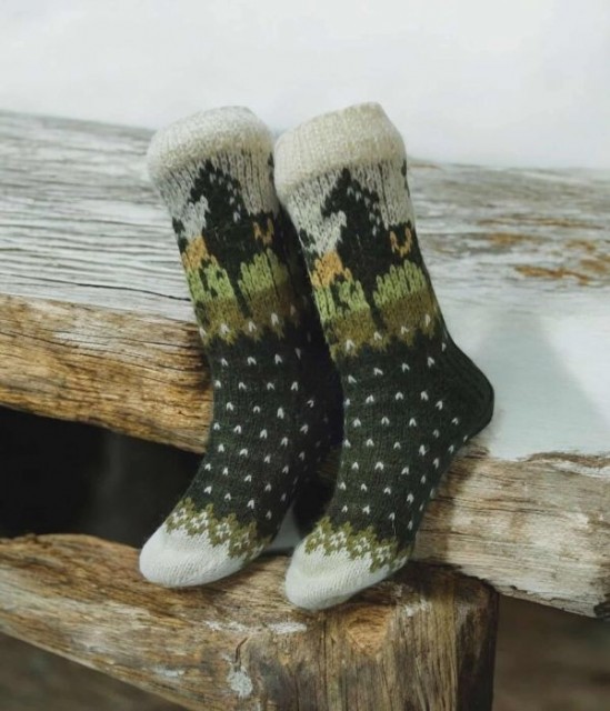 Disse hjemmestrikkede damesokkene er laget av 100 % naturlig ull og holder føttene varme gjennom hele vinteren. Med et vakkert hestemotiv og harmoniske grønne nyanser passer de perfekt for både hesteelskere og alle som setter pris på håndverk og kvalitet.