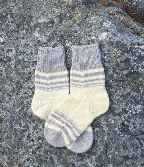 Disse ullsokkene er strikket for hånd med omtanke og kvalitet. De er laget av 100 % ull som gir naturlig varme og pusteevne. Det enkle designet i hvitt med grå striper passer perfekt til både hverdag og tur.