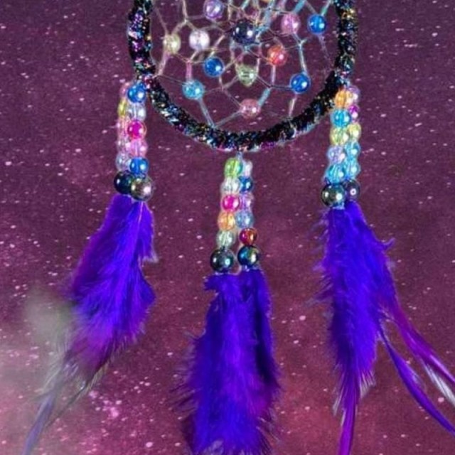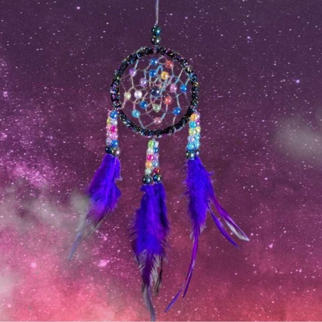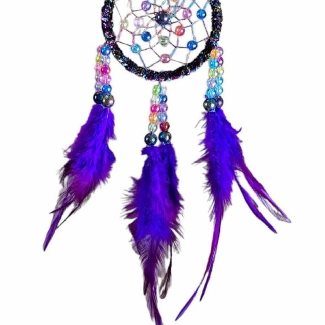 Denne dekorative drømmefangeren med lilla fjær og fargede perler passer perfekt som veggpynt i soverom, barnerom eller andre rom der du ønsker en rolig og personlig atmosfære. Ifølge tradisjonen skal drømmefangere beskytte mot vonde drømmer og slippe inn de gode - samtidig som de tilfører interiøret en vakker, håndlaget detalj.