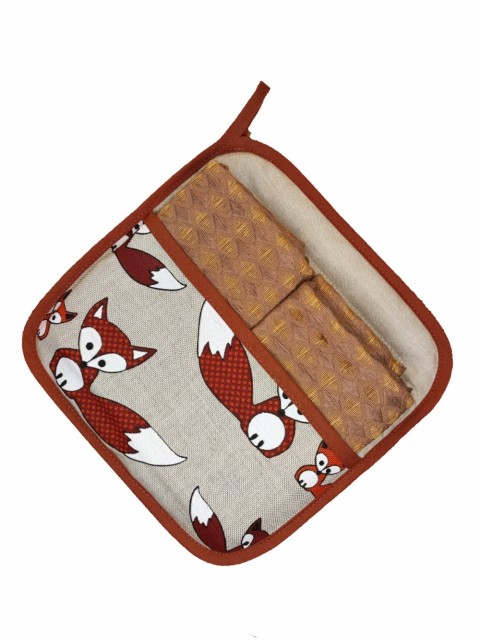 To kjøkkenhåndklær i brunfarge og en gryteklut med søtt revmotiv. Perfekt til hytta, gaven eller det naturlige kjøkkenet.