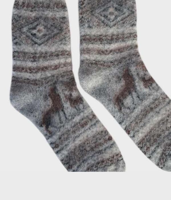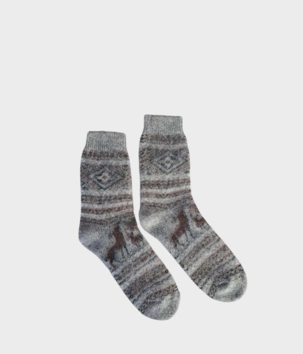 Tykke ullsokker i størrelse 43–45 med reinsdyrmotiv i klassiske farger som grått og brunt. Disse varme ullsokkene er laget av en myk og isolerende ullblanding som gir komfort hele dagen – perfekt for kalde dager hjemme, på hytta eller ute i vinterkulda.