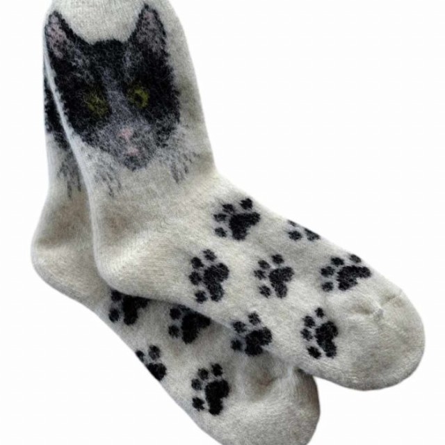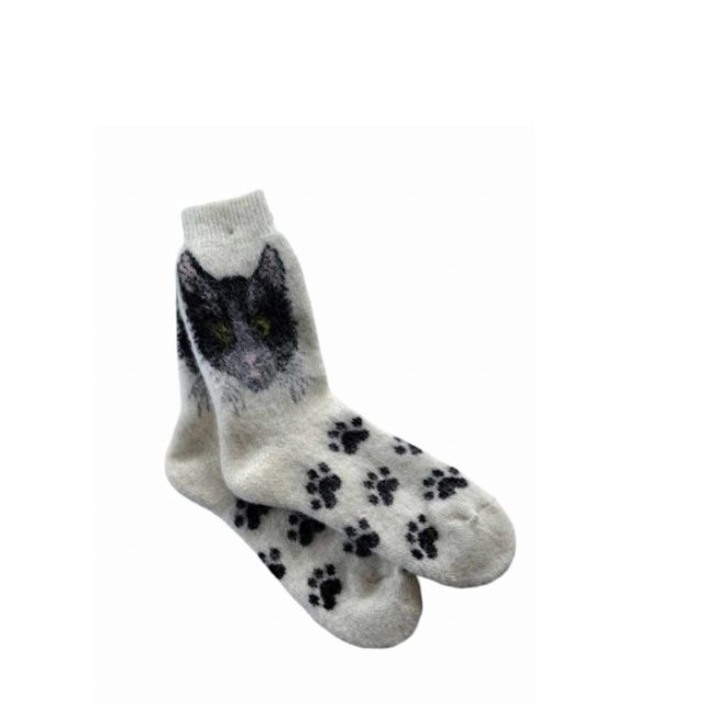 Hold føttene varme og stilige med disse myke ullsokkene med sjarmerende kattemotiv. Sokkene er laget i en behagelig ullblanding som gir både varme og komfort gjennom kalde dager. Perfekte til innekos, hytteturer eller som en koselig gave til en katteelsker.