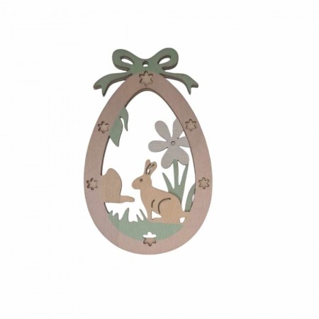 Dekorativt påskeegg i tre med påskehare. Består av to deler og er klart til oppheng.