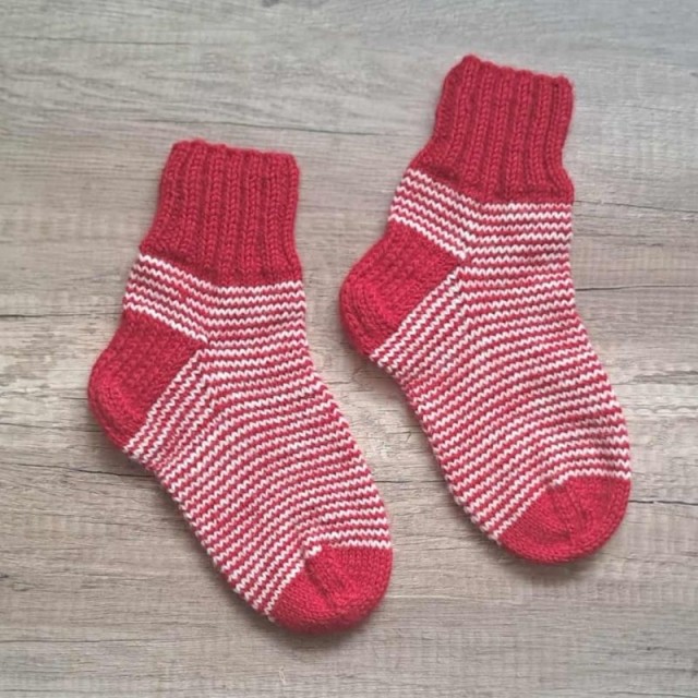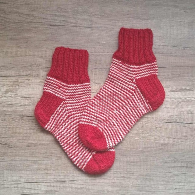 Varme ullsokker til barn i størrelse 31–32, strikket for hånd i klassiske røde og hvite striper. Perfekte for kalde dager og ekstra fine til jul! Laget i 100 % ull som både varmer og puster.