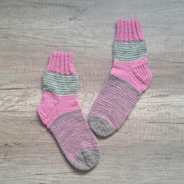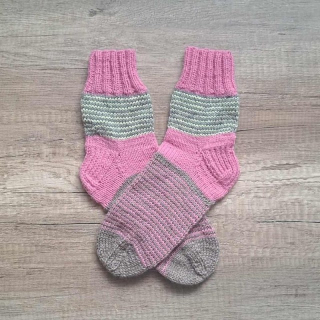 Varme ullsokker til barn i størrelse 32–33, strikket for hånd med grønne og grå striper.