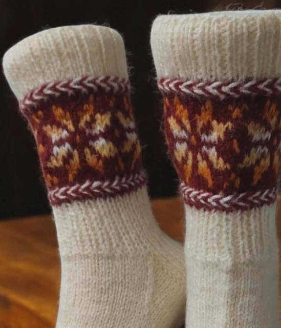Disse ullsokkene er håndstrikket i 100 % ull og har blomstermotiv. Med fokus på kvalitet, komfort og passform holder de føttene varme både inne og ute på kalde høst- og vinterdager. Et unikt og vakkert tilskudd til garderoben, eller en flott gave til noen som setter pris på håndlaget kvalitet.