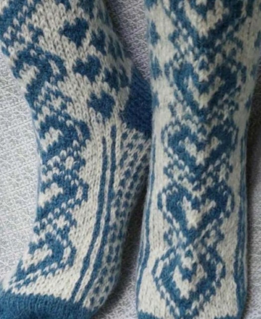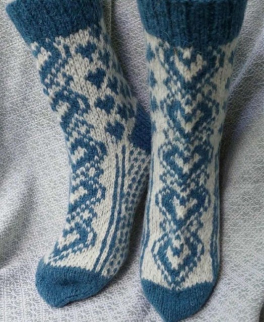 Med et nydelig blått og hvitt fargespill og dekorative hjerter passer de perfekt til kalde dager – enten hjemme, på hytta eller som en koselig gave.