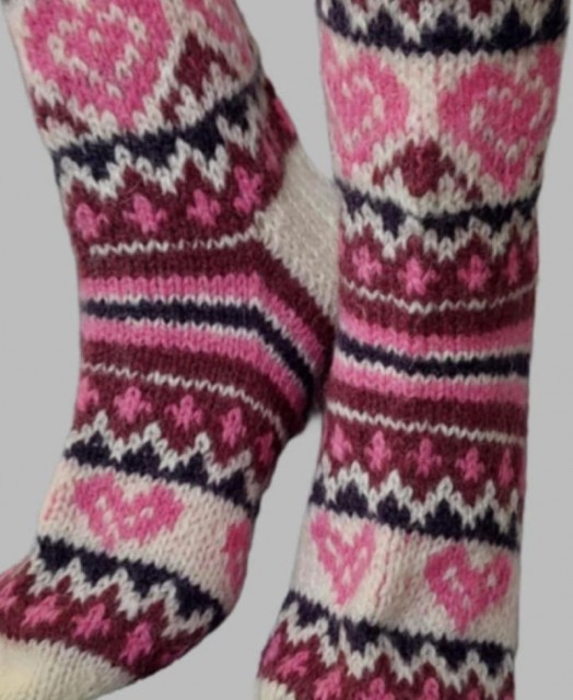 Disse nydelige damesokkene er håndstrikket med kjærlighet i 100 % ren ull. Med søte rosa hjerter er de både varme og dekorative - perfekte som gave eller til egen hverdagsluksus.