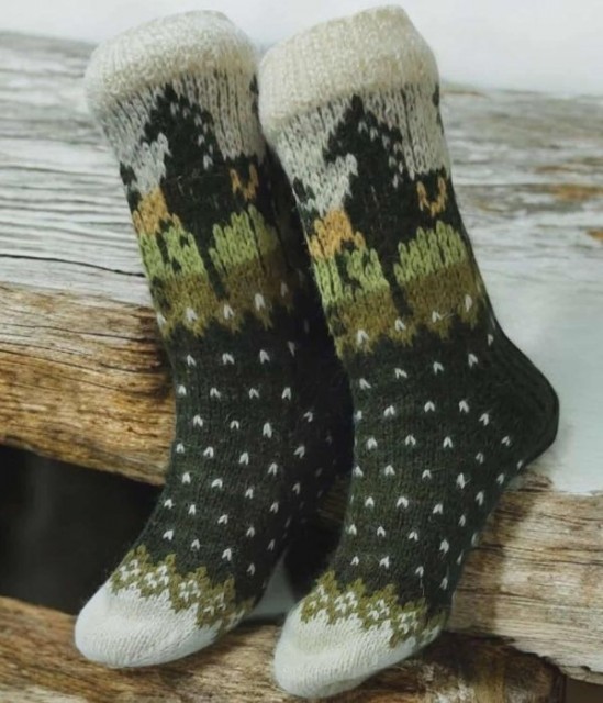 Disse hjemmestrikkede damesokkene er laget av 100 % naturlig ull og holder føttene varme gjennom hele vinteren. Med et vakkert hestemotiv og harmoniske grønne nyanser passer de perfekt for både hesteelskere og alle som setter pris på håndverk og kvalitet.