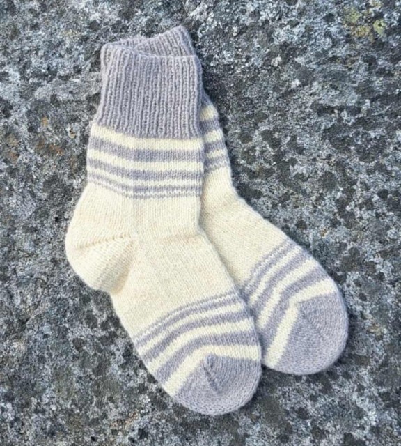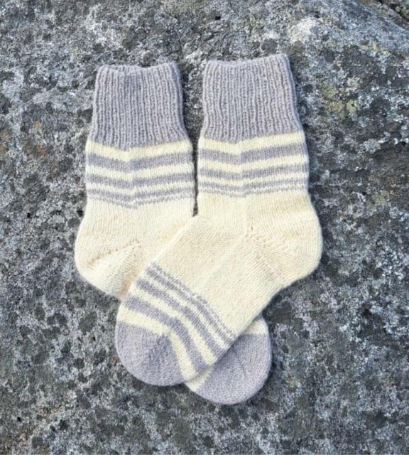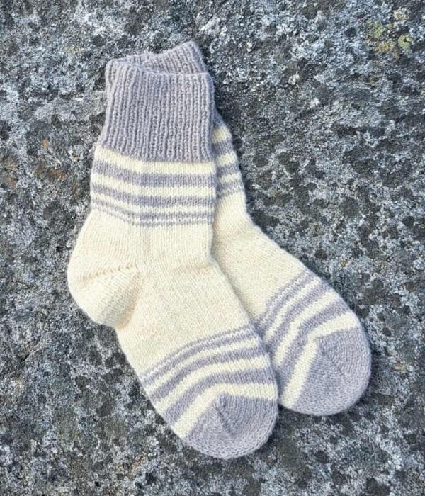Disse ullsokkene er strikket for hånd med omtanke og kvalitet. De er laget av 100 % ull som gir naturlig varme og pusteevne. Det enkle designet i hvitt med grå striper passer perfekt til både hverdag og tur.