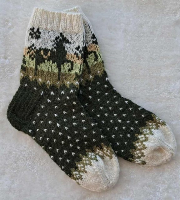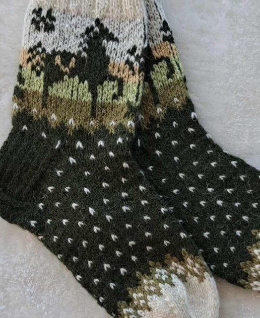 Håndstrikkede ullsokker til herre, laget i 100 % ull med dekorativt hestemotiv i grønne og hvite toner. Myke, varme og unike – perfekte for kalde dager og deg som setter pris på kvalitet og håndverk.