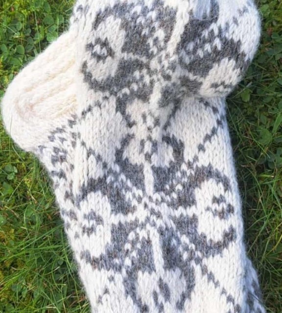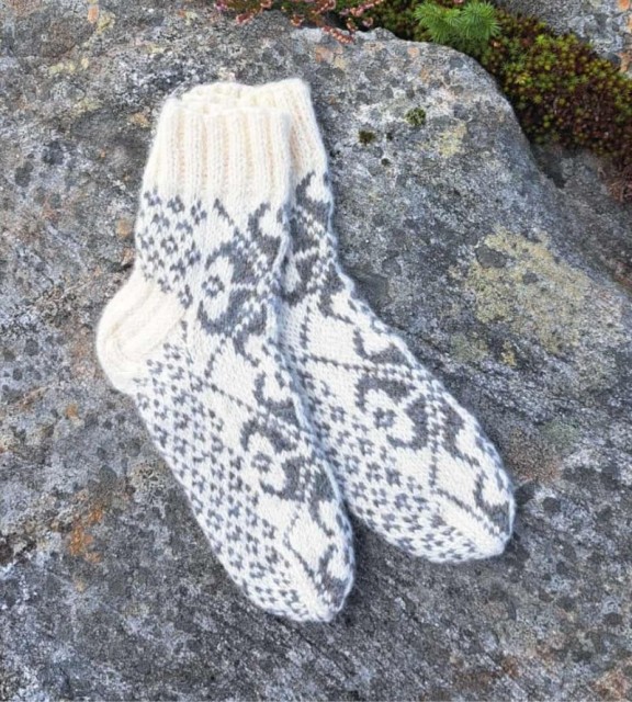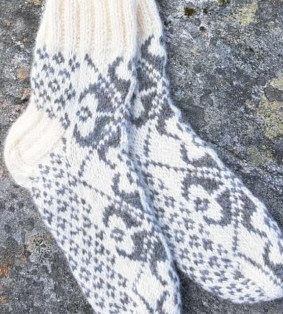 Disse ullsokkene er strikket for hånd, laget av 100 % ull som gir naturlig varme og komfort. Perfekte for daglig bruk, turer og vinterdager. Tidløst mønster i grått og hvitt gjør dem både praktiske og stilrene.