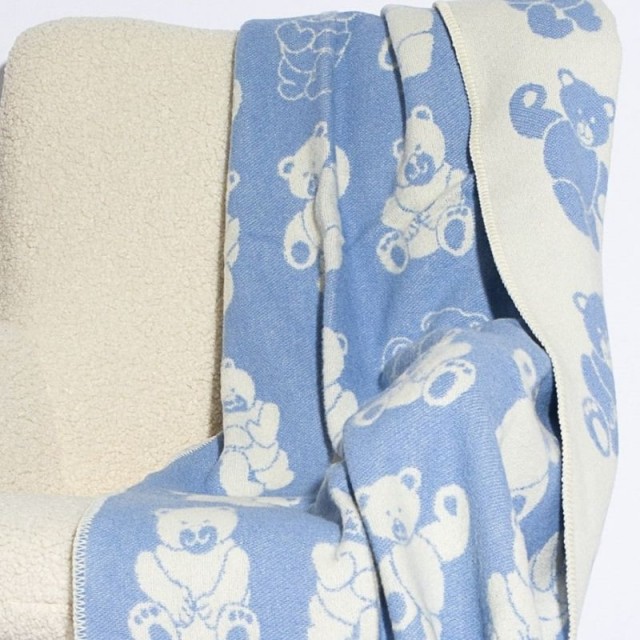 Det søte bamsemønsteret gir en lun og koselig stemning, mens ullens naturlige egenskaper holder barnet varmt samtidig som den regulerer temperaturen. Pleddet er både funksjonelt og dekorativt - en fin gaveidé til dåp, bursdag eller babyshower.