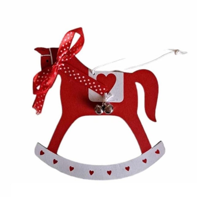 Denne dekorative hesten i rødt og hvitt er laget av tre og har et klassisk, nostalgisk uttrykk. Passer perfekt på juletreet, i vinduet eller som pynt på et juledekket bord.