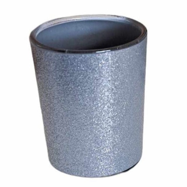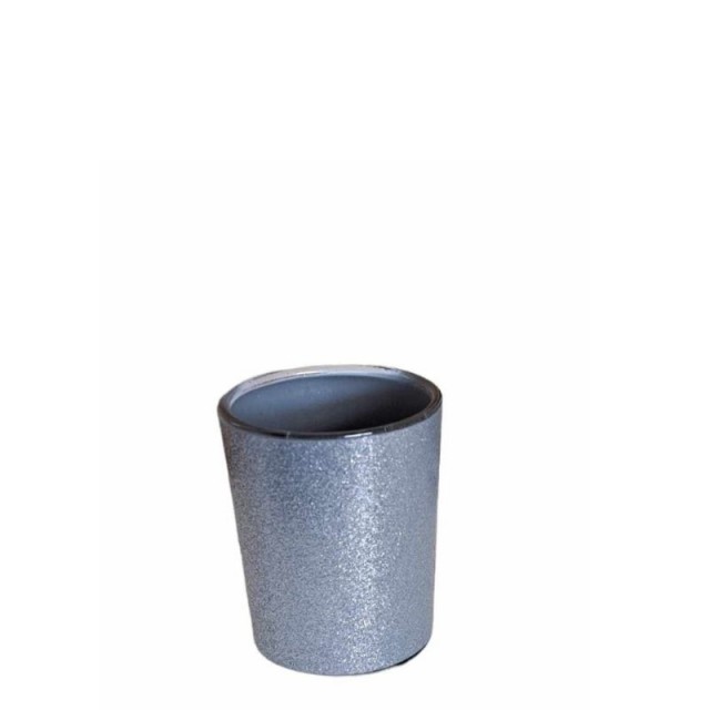 Liten sylinderformet telysholder i glass med sølvfarget glitter - perfekt til å skape stemning og glans.