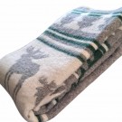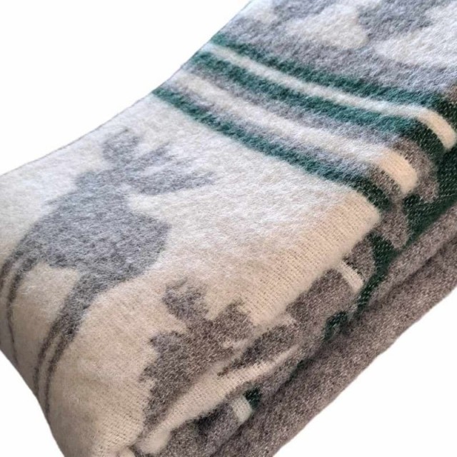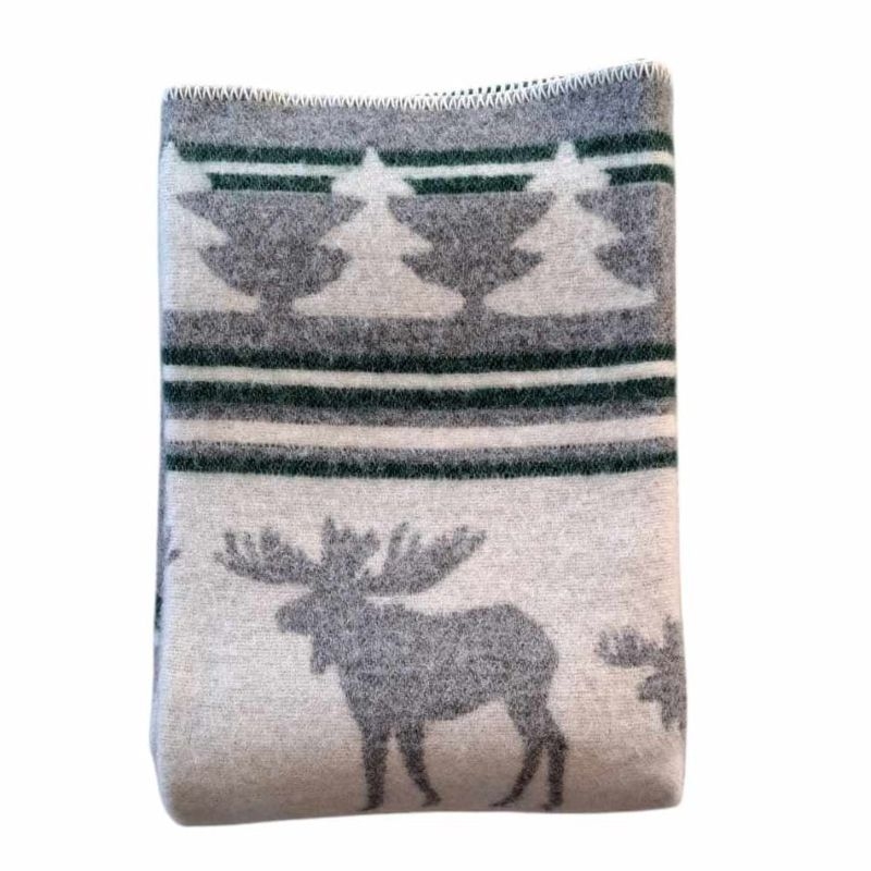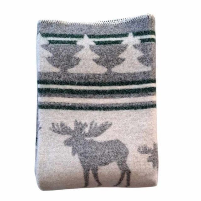 Dette vakre ullpleddet med elgmotiv skaper en koselig og innbydende atmosfære i hjemmet ditt. De varme grønne og grå tonene passer perfekt både til hjemmet og hytta.