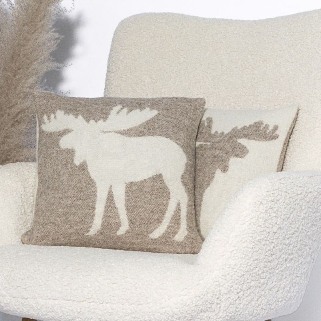 Dekorativt ullputetrekk med elgmotiv i varm beige farge. Laget av 100 % ull, mykt og holdbart - perfekt for å skape en lun og naturlig stemning i sofaen, godstolen eller på hytta. En flott gaveidé til naturelskere, hyttefolk eller jegeren som har alt.