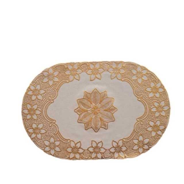 Oval spisebrikke i plast med elegante beige og gullfarger – et dekorativt og praktisk innslag som beskytter bordet og løfter borddekkingen.