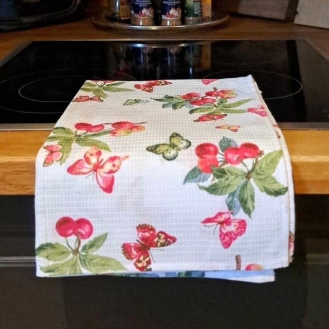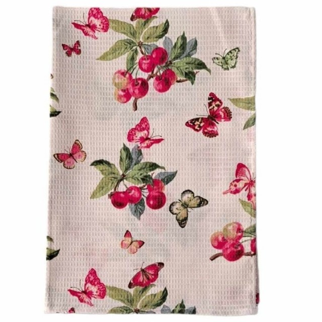 Dette sjarmerende kjøkkenhåndkleet i 100 % bomull kombinerer praktisk funksjon med et friskt og sommerlig uttrykk. Med sitt livlige kirsebærmotiv bringer det en hyggelig fargeklatt til kjøkkenet, enten du bruker det til oppvask, baking eller bare som pynt.