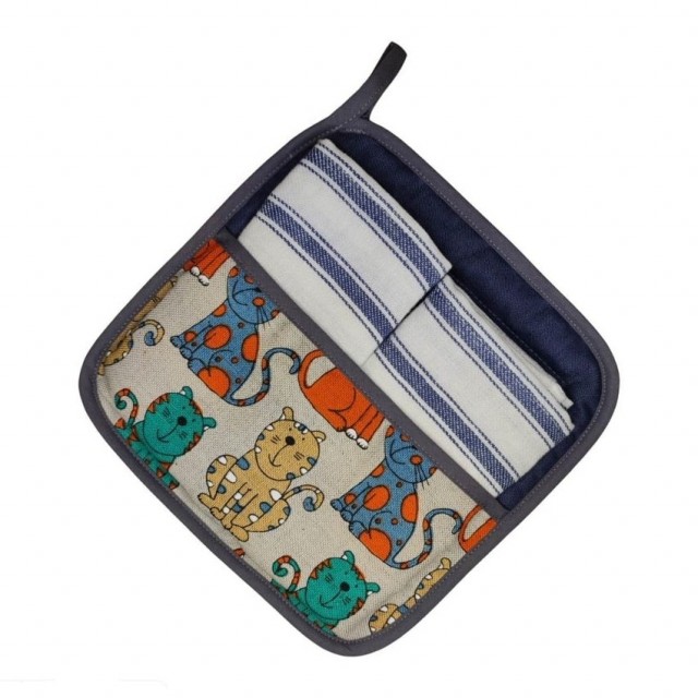 Et dekorativt og funksjonelt sett til kjøkkenet: to rutete kjøkkenhåndklær og én gryteklut med kattemotiv. Laget i en slitesterk lin og bomullsblanding - perfekt både til hverdagsbruk og som gave.