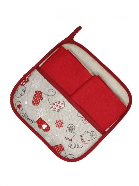 To røde kjøkkenhåndklær og en gryteklut med koselig julemotiv. Perfekt til førjulstid, gave eller pynt på kjøkkenet.