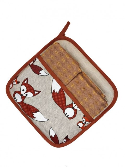 To kjøkkenhåndklær i brunfarge og en gryteklut med søtt revmotiv. Perfekt til hytta, gaven eller det naturlige kjøkkenet.