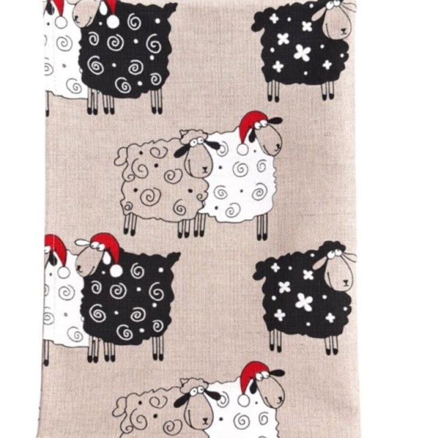 Kjøkkenhåndkle i lin og bomull - sauer med røde nisseluer. Et praktisk og dekorativt håndkle som passer perfekt til kjøkkenet i førjulstiden, eller som en liten gave til hytteeieren, dyreelskeren eller den som elsker jul. Materialet er slitesterkt, naturlig og godt absorberende, like fint til pynt som i bruk.