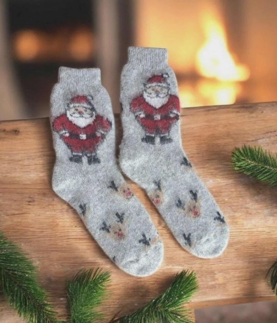 Myke og varme ullsokker med julenisse og reinsdyr, laget av naturlig ull for maksimal komfort i vinterkulden. Det festlige motivet med nisse og reinsdyr sprer julestemning – perfekt som gave eller til deg selv.