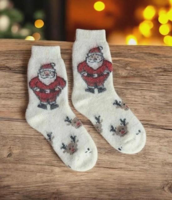 Tykke ullsokker med julenisse og reinsdyr. Laget av myk og pustende ull, holder disse sokkene føttene varme gjennom kalde dager. Det klassiske julemotivet med nisse og reinsdyr gir en festlig stemning – perfekt til hverdagsbruk, på hytta eller som en sjarmerende gave til familie og venner.