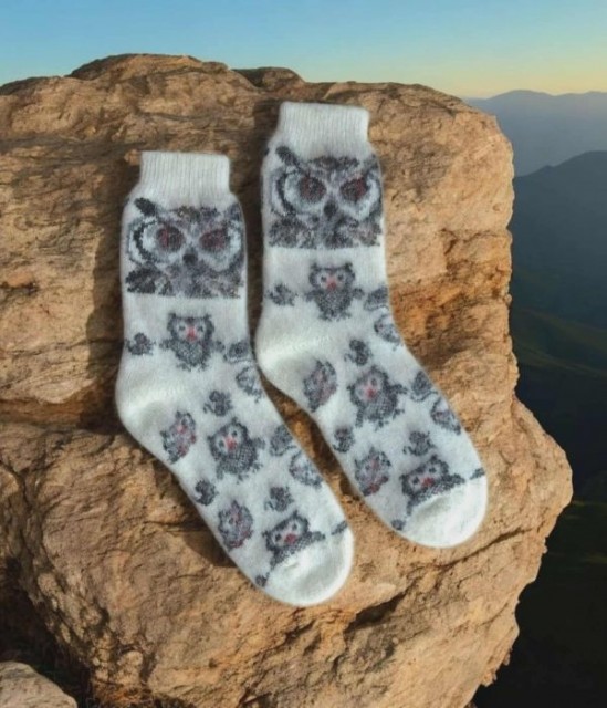 Ullsokker med uglemotiv, laget av myk og naturlig ull som holder føttene varme hele vinteren.