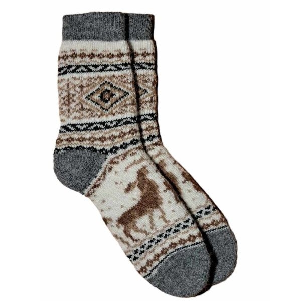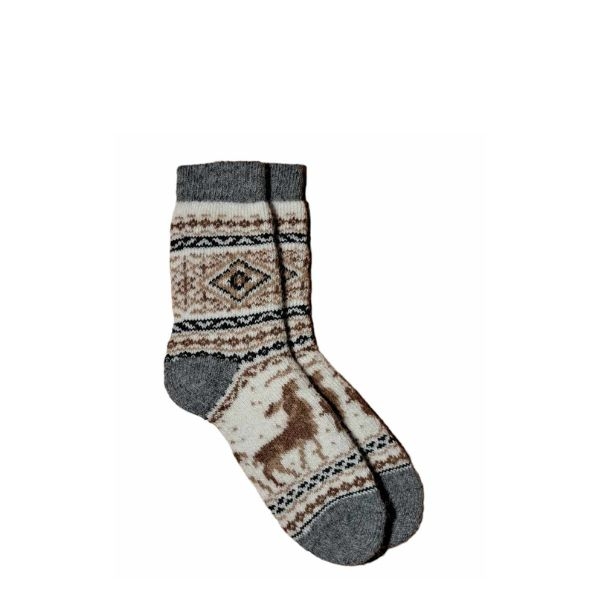 Disse tykke ullsokkene i grått, hvitt og brunt har et tidløst reinsdyrmotiv som skaper ekte vinterstemning. Laget i kløfri og behagelig ull som holder føttene varme og komfortable. Perfekte for kalde dager hjemme, på hytta eller som en koselig gave.