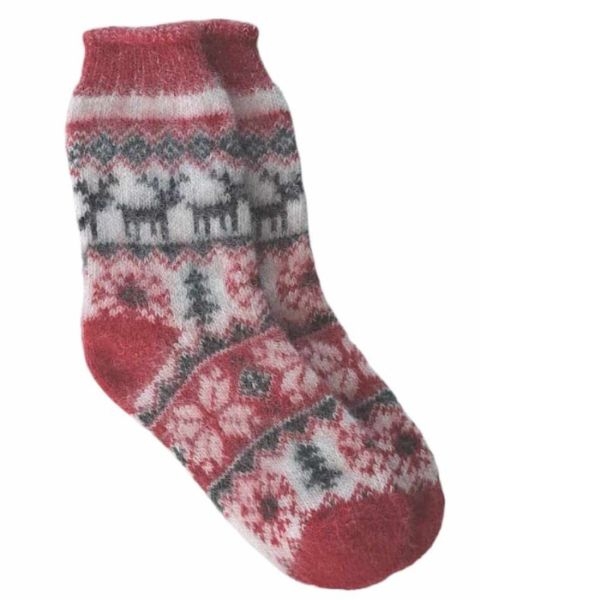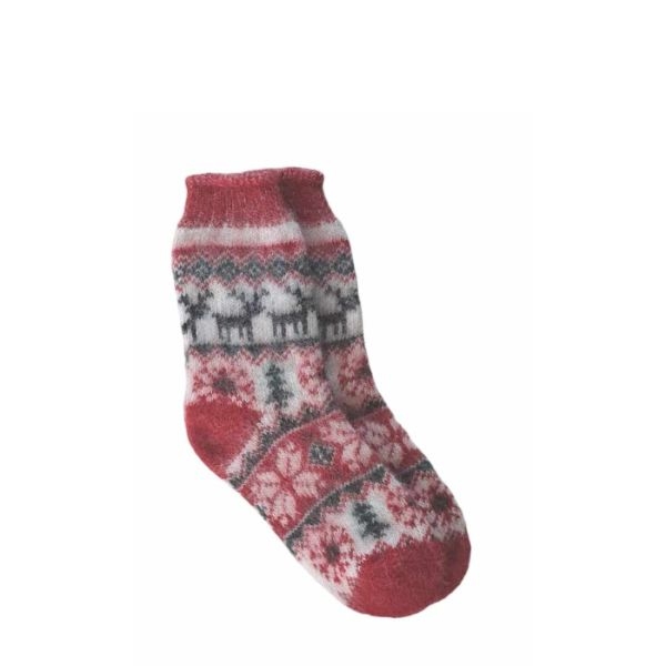 Varme, tykke ullsokker med julemotiv – i klassisk rødt for ekte julestemning.