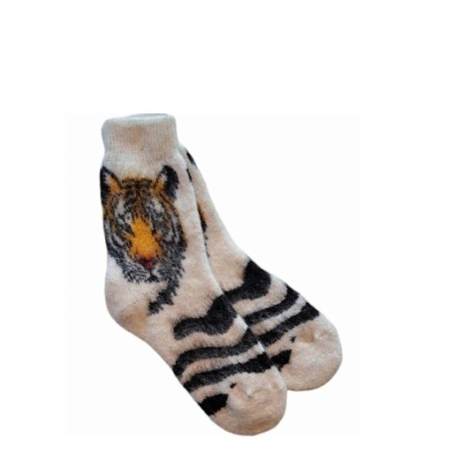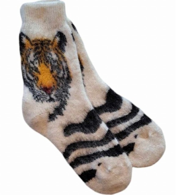 Ullsokker med tigermotiv. Gjør deg klar for skikkelig innekos med disse myke og varme ullsokkene. Det morsomme tigermotivet gir sokkene personlighet, mens den kløfrie ullen holder føttene gode og varme hele dagen. Perfekte for rolige morgener, kalde kvelder og alt imellom.